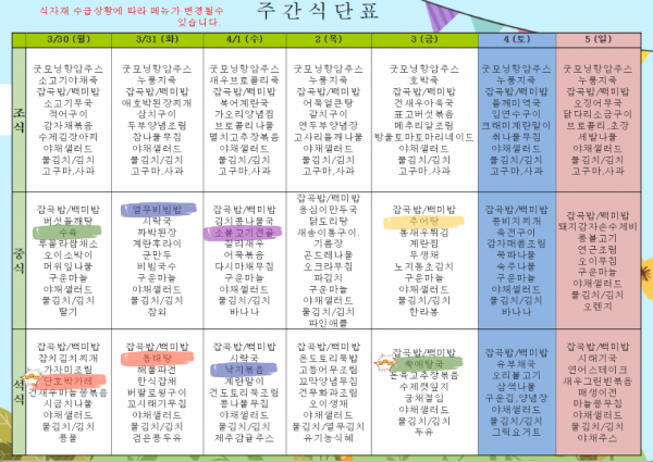 3월5주 식단입니다 페이지 정보 작성자 씨에스의원 댓글 0건 조회 56회 작성일 26-03-28 12:34 목록 답변 본문 3월30일~4월5일 이전글4월1주 식단입니다 26.04.04 다음글3월4주 식단입니다 26.03.21 댓글 0 댓글목록 등록된 댓글이 없습니다.